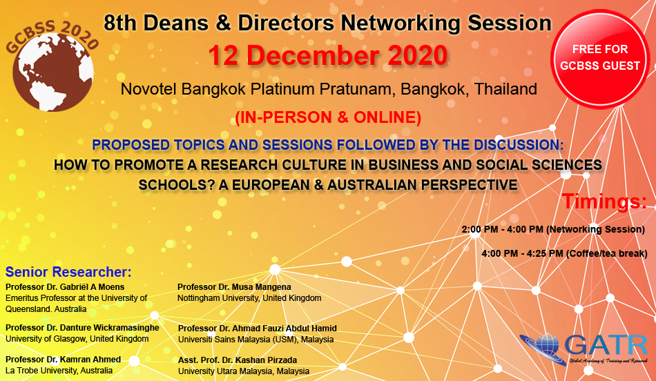 Global Academy of Training and Research (GATR), is a registered research firm in Malaysia that provides platforms for academics and organizations to excel. GATR aims at encouraging young scholars, established researchers, trainers, academic & corporate researchers to conduct meaningful research and provide useful knowledge for the academic and socio-economic development of their respective nations. GATR is organizing the 8th Deans and Directors Networking Session & Discussion in Bangkok, Thailand.