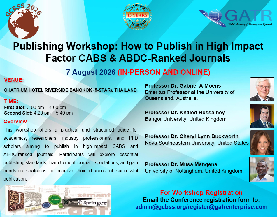 18th Global Conference on Business and Social Sciences (18th GCBSS) concurrent event workshop on ''How to Publish in CABS and ABDC Ranked Journals". The workshop is free for all registered 18th GCBSS guests.