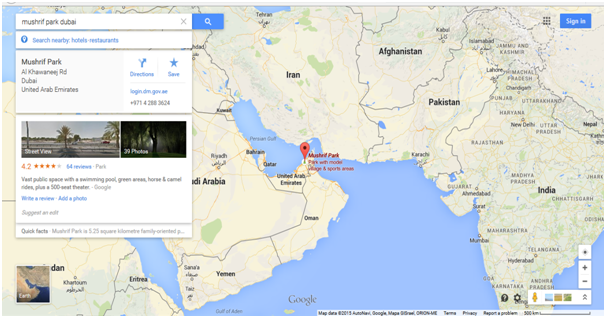 Mushrif Park is 5.25 square kilometre (1300 acre) family-oriented park in Dubai, United Arab Emirates. It is located in the eastern part of the city (near the suburb of Khawaneej), about 16 km (10 mi) from the traditional center of Dubai. The park was created in early 1980 by Dubai Municipality and was hugely expanded and refurbished in 1989.
