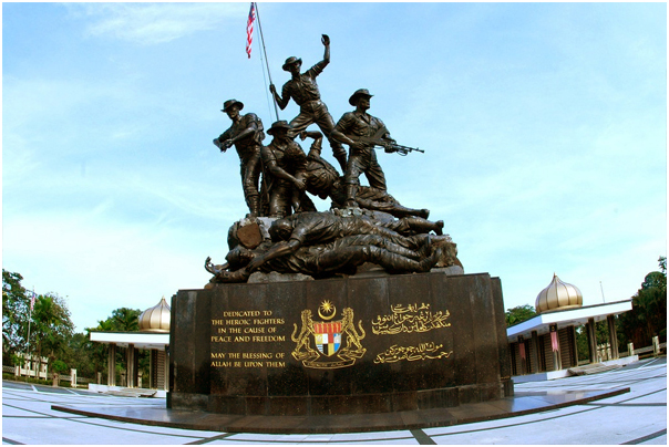 The topmost figure, at the centre, holds aloft the Malaysian flag. He is flanked on the left and right by two other soldiers, both armed; the figure on the left is armed with a machinegun, while the other carries a rifle and a bayonet.
